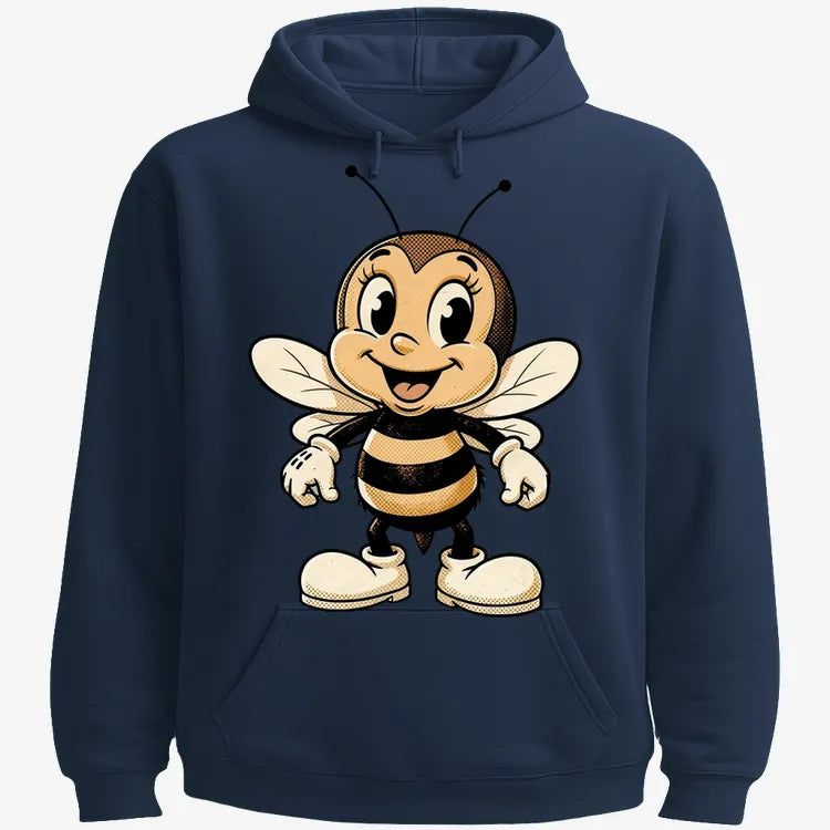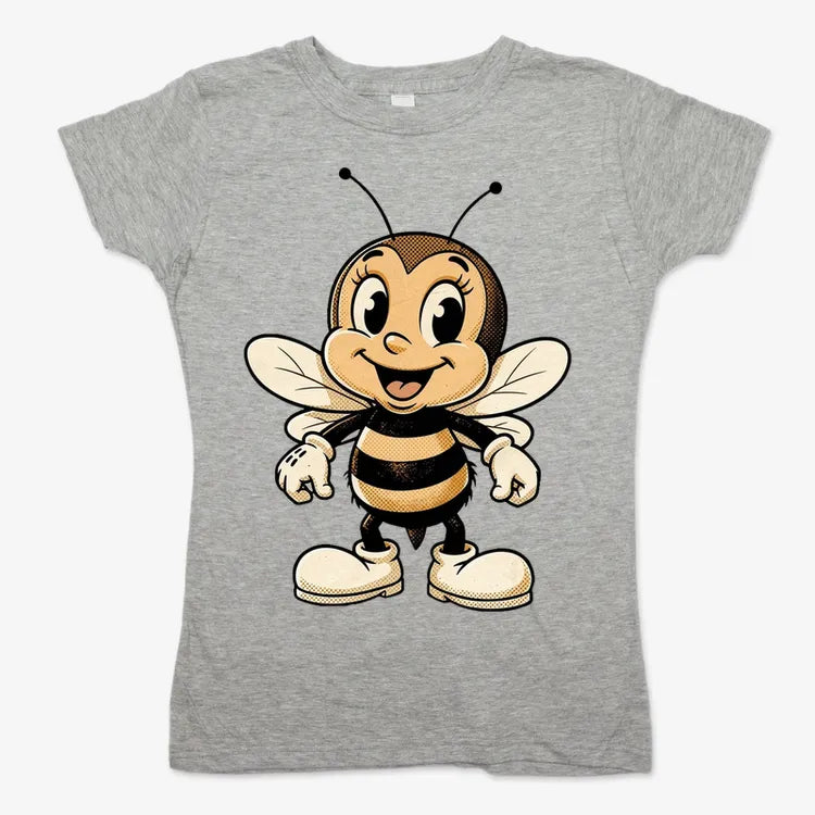 Golden‑age cartoon bee mascot with daisies in warm amber on faded sage—playful and nostalgic.